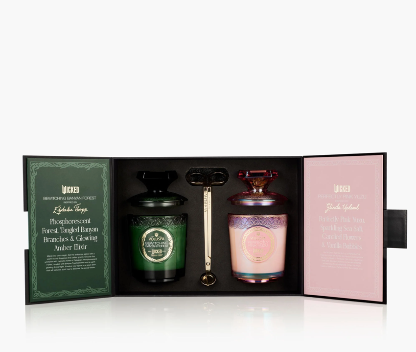 Includes an exclusive wick trimmer and two 8.5oz candles: Elphaba's Bewitching Banyan Forest and Glinda's Perfectly Pink Yuzu