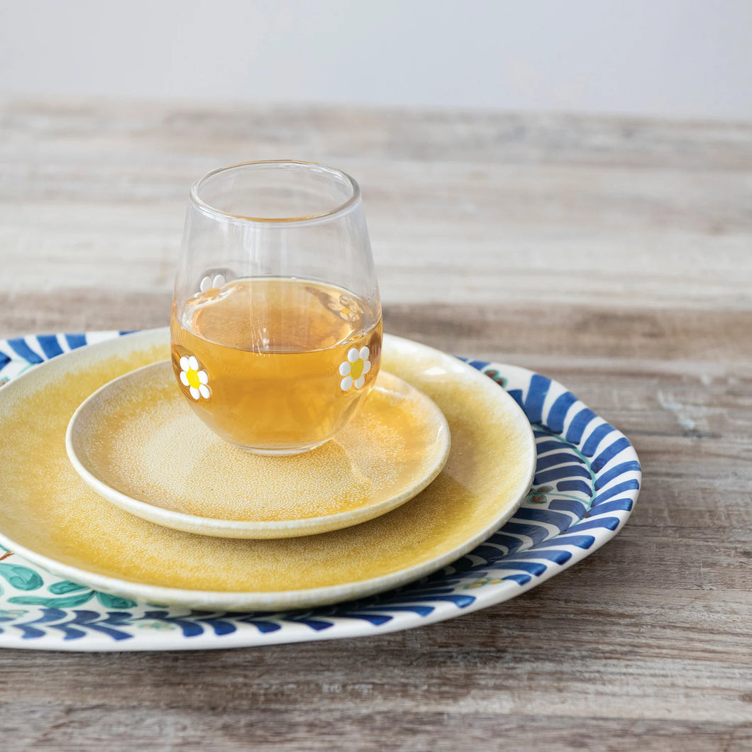 3-3/4" Round x 4-3/4"H 16 oz. Drinking Glass w/ Embedded Daisies, White & Yellow