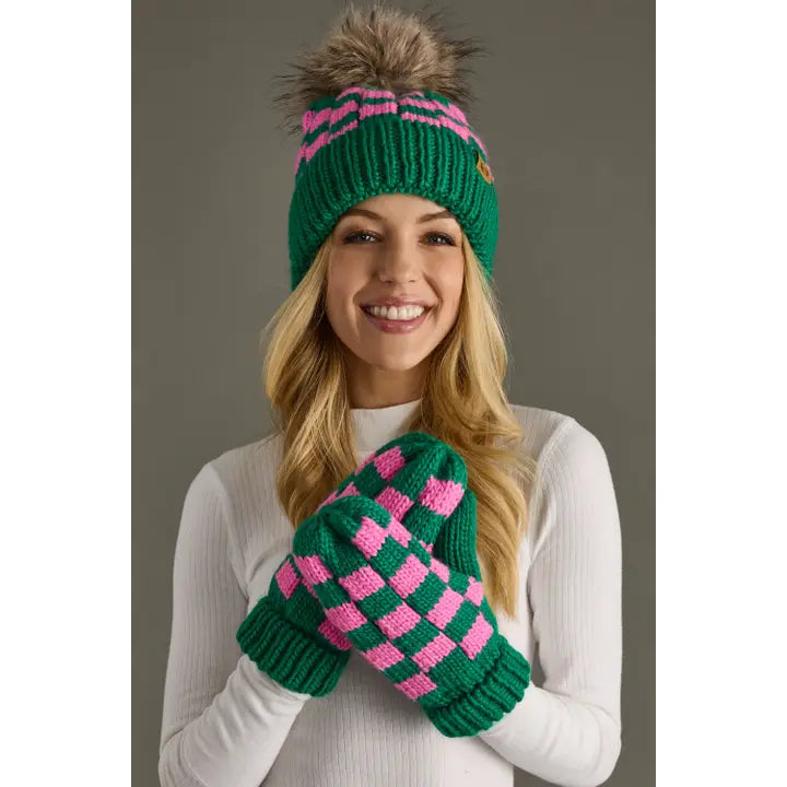 Green and Pink Checkered Pom Hat